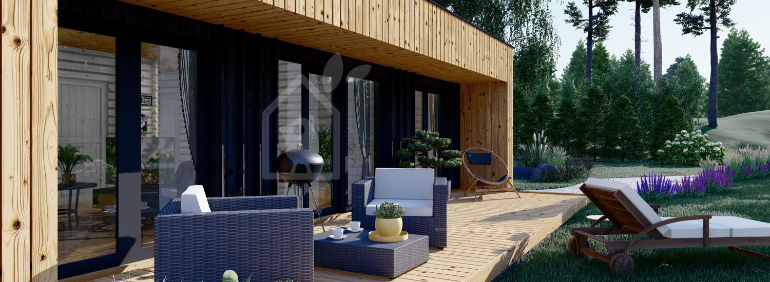Kütük kabin KAYA, konfor ve rahatlık arayan herkesi tatmin ederken aynı zamanda doğaya daha yakın bir yaşam deneyimi yaşama fırsatı da sunuyor. Satın alma işleminize eklemeyi tercih ederseniz, neredeyse tavandan tabana cam kapılardan herhangi birine hızlı bir bakış, geniş terasa doğru sakinleştirici bir manzara sunacaktır. Bina yalıtımı, açık mutfakta aile toplantıları için alanlar, yatak odasında iyi bir gece uykusu ve ihtiyaç duyulan yerlerde daha fazla alan için bir depo alanı sunuyor. Bahçenizin en iyisini ortaya çıkaracak ustalıkla hazırlanmış tasarımı keşfedin!