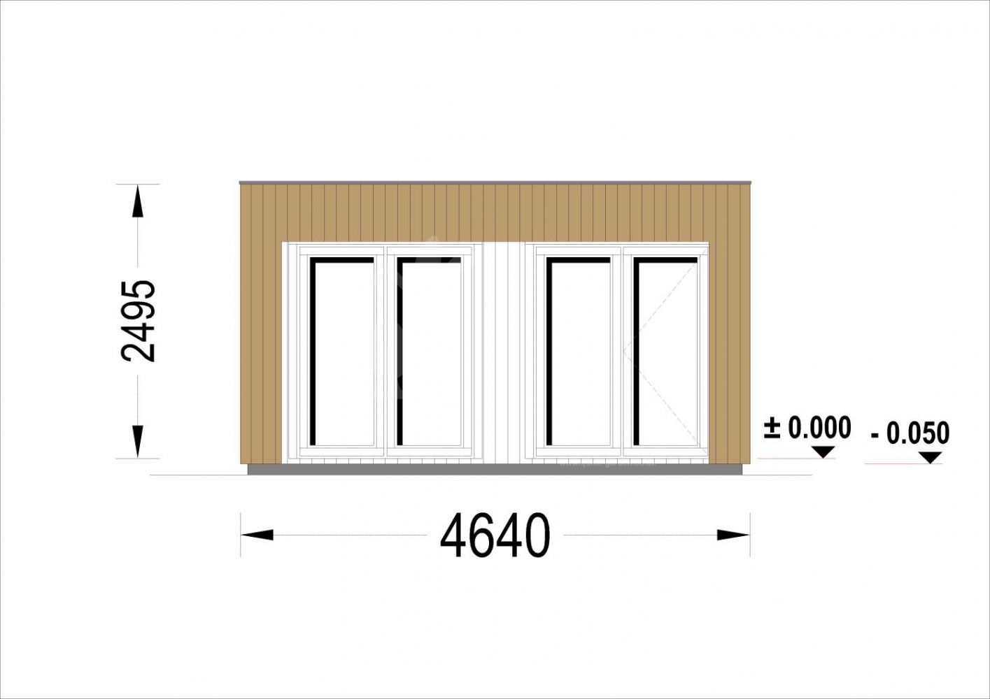 | Wall | 34 mm log boards; 100 mm timber frame; 25 mm timber beam (vertical); 25 mm timber beam (horizontal); 18 - 20 mm timber cladding |